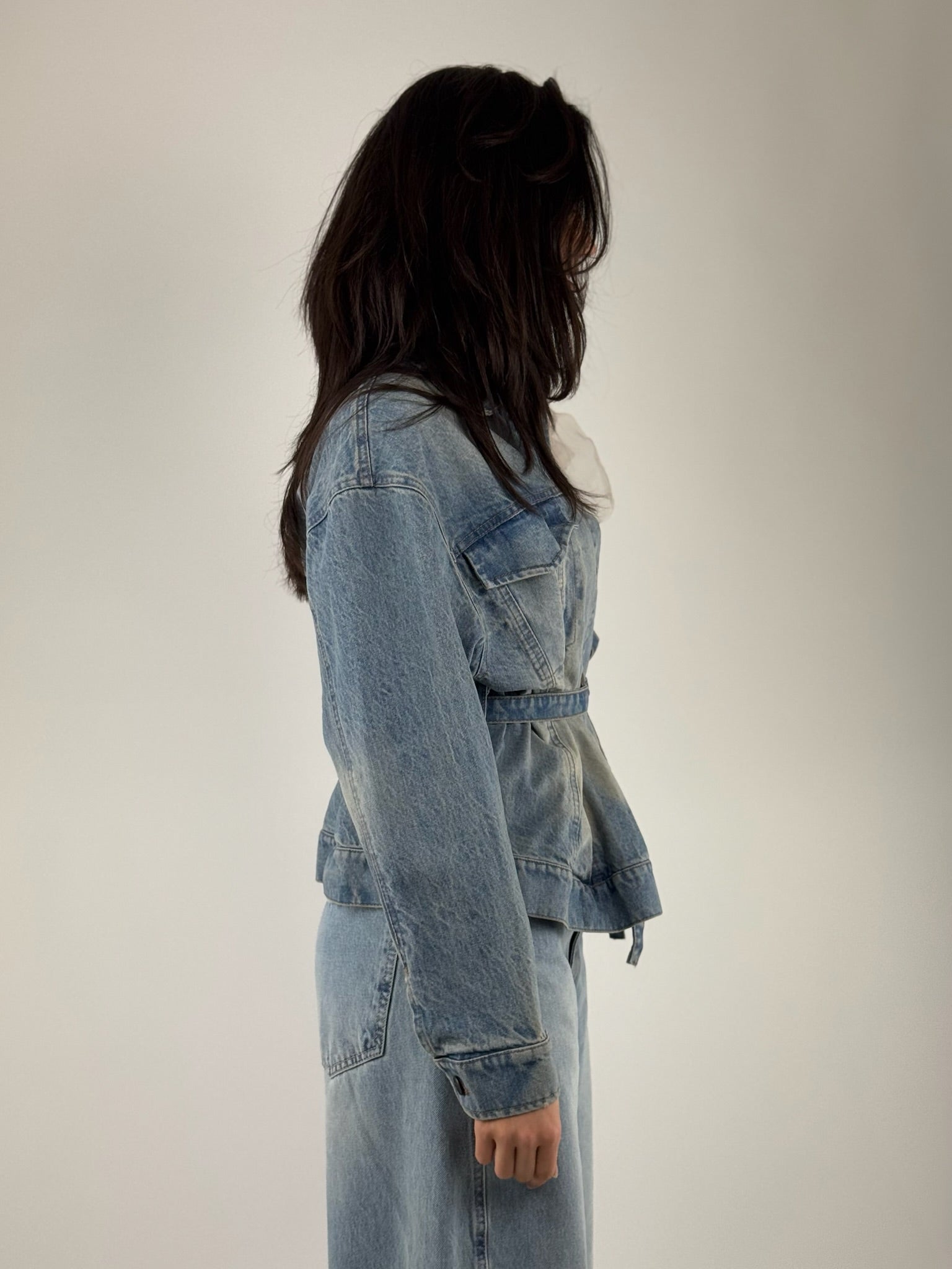 • Giacchino in denim ,dalla spalla ampia , chiuso in vita con una cintura, con spilla fiore removibile.