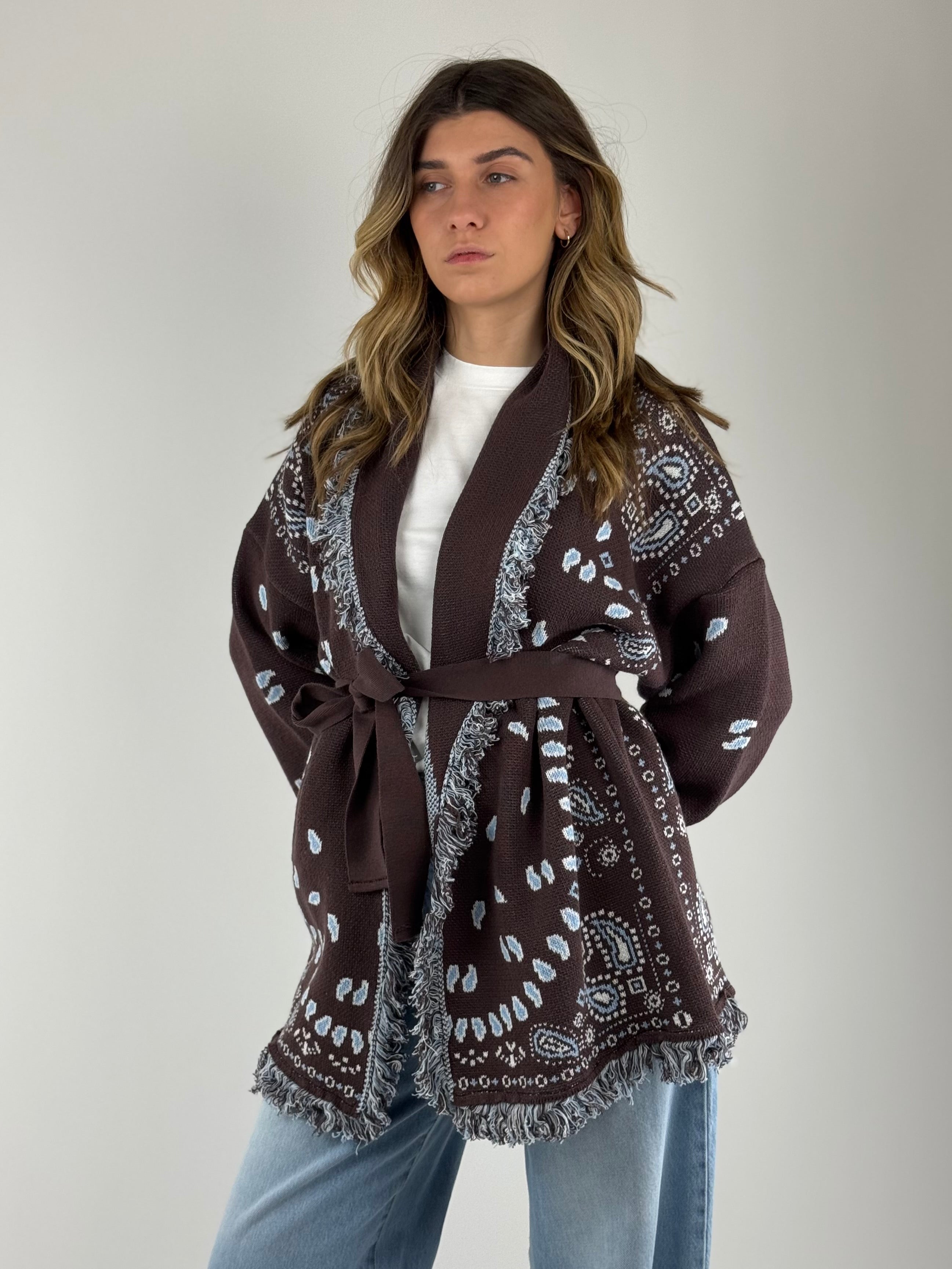 • Cardigan Alanui con cintura e frange, tessuto cotone.