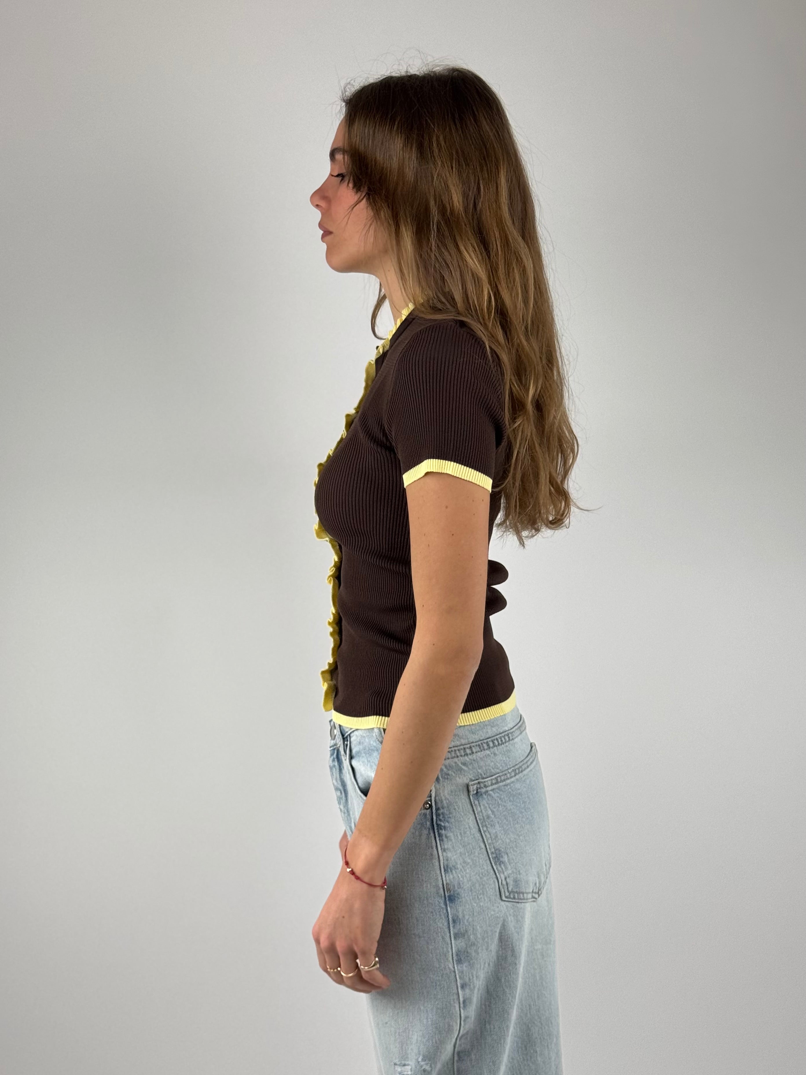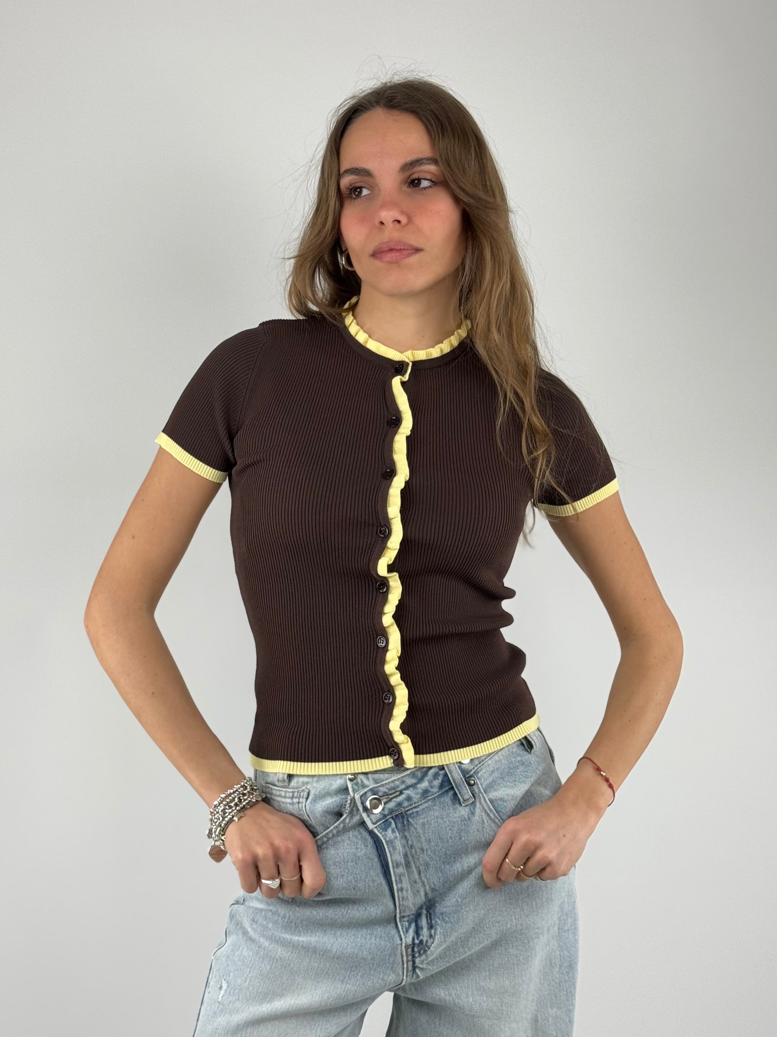 • Cardigan in viscosa , tessuto elasticizzato, con rouches a contrasto colore.