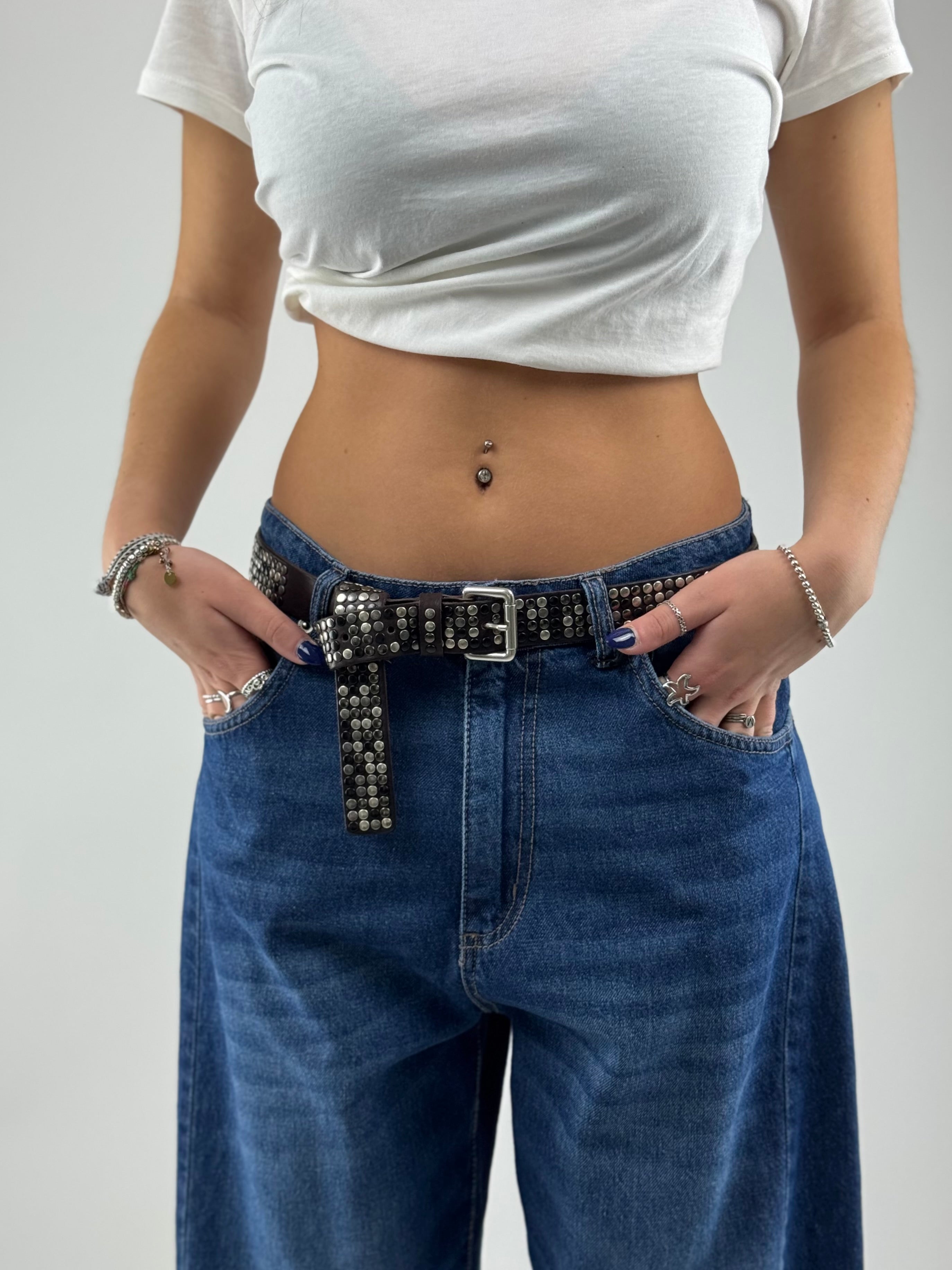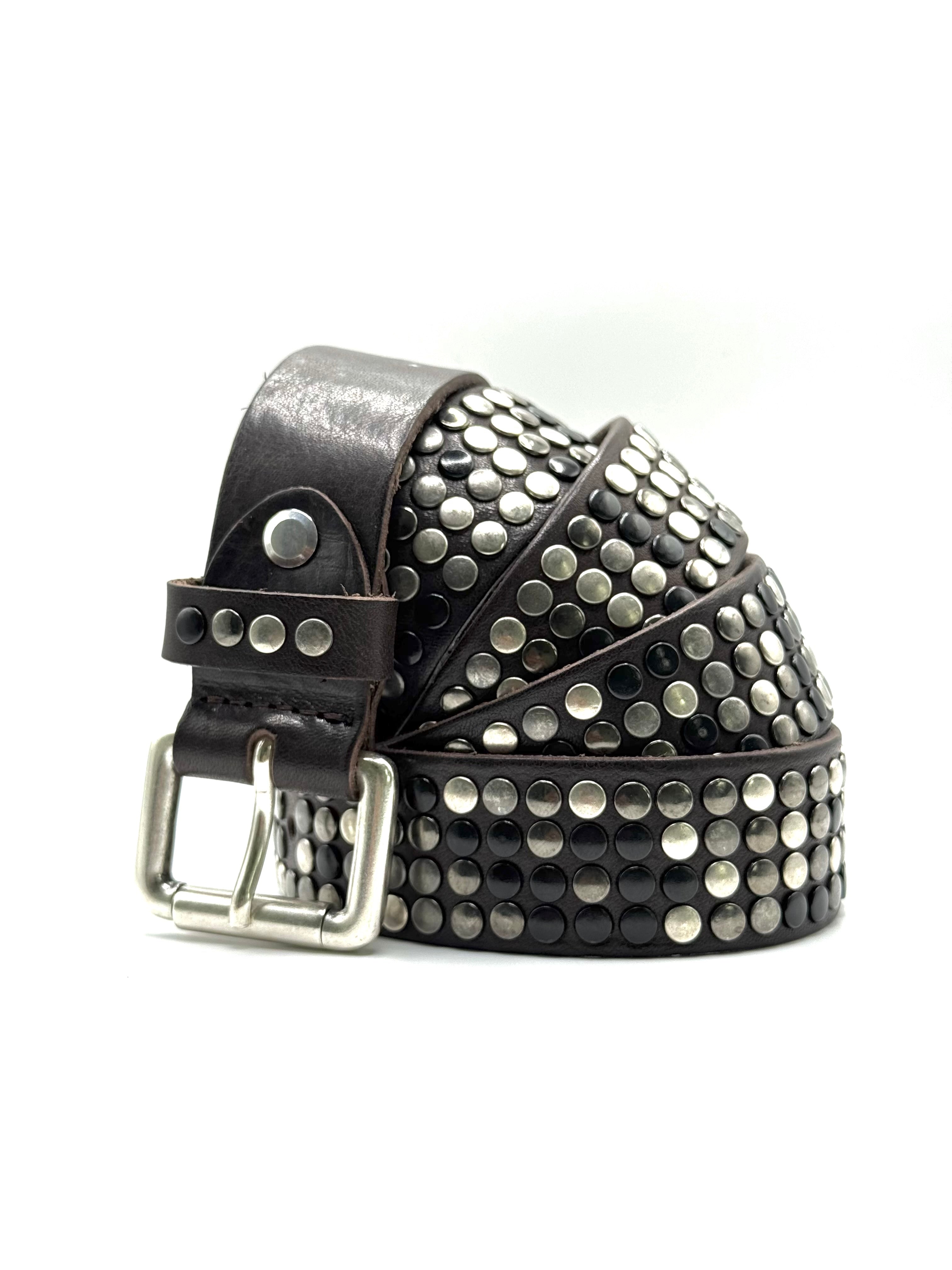 • Cintura in vera pelle, borchiata a mano con quattro file di borchie.