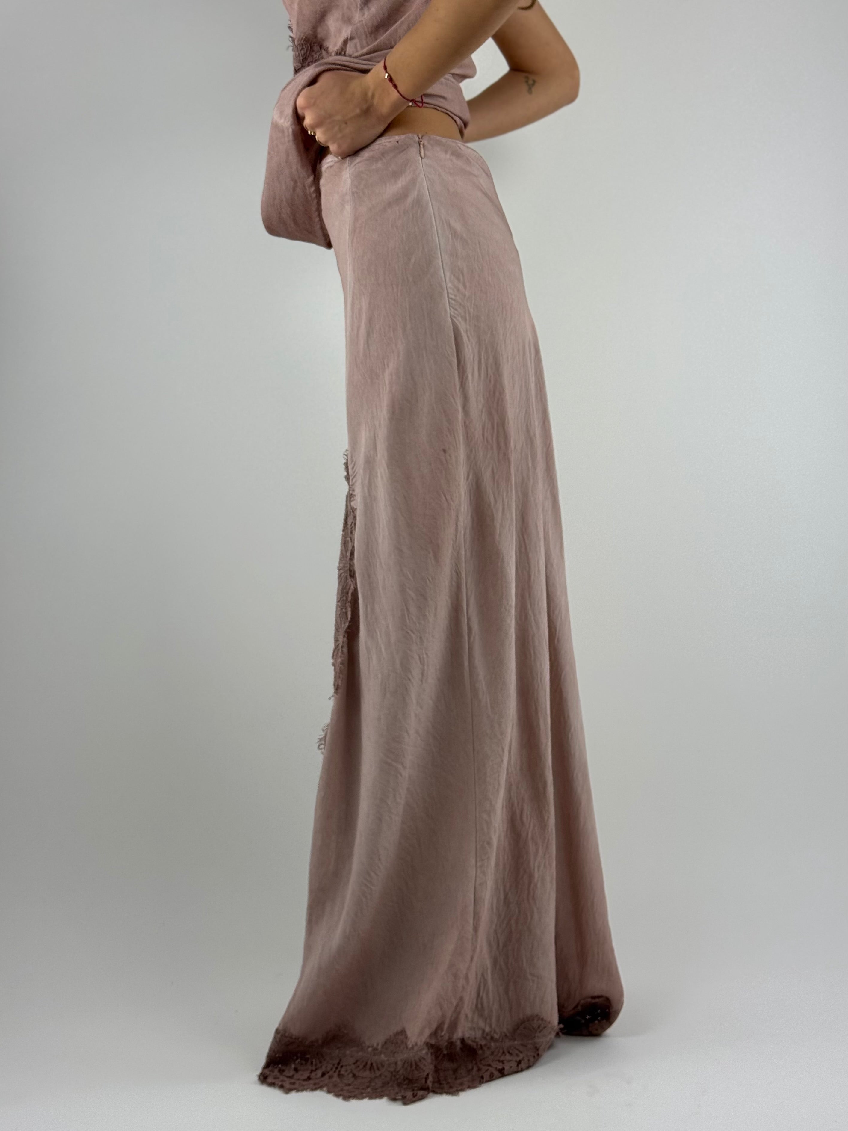 • Gonna lunga , effetto seta, con chiusura zip e spacco con pizzo, laterale.