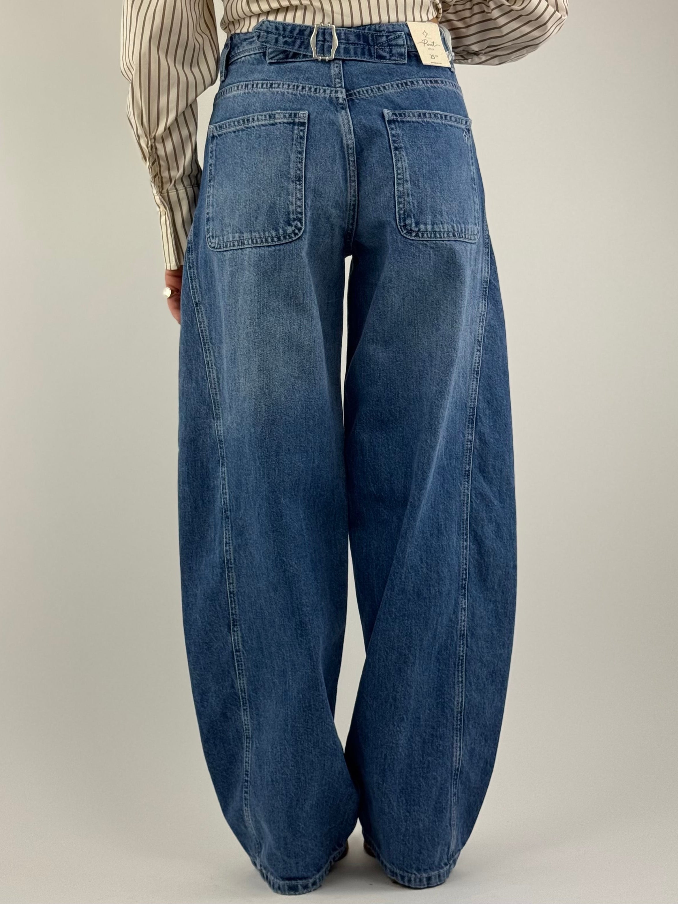• Jeans barrel wide leg, con cinturino sul retro.