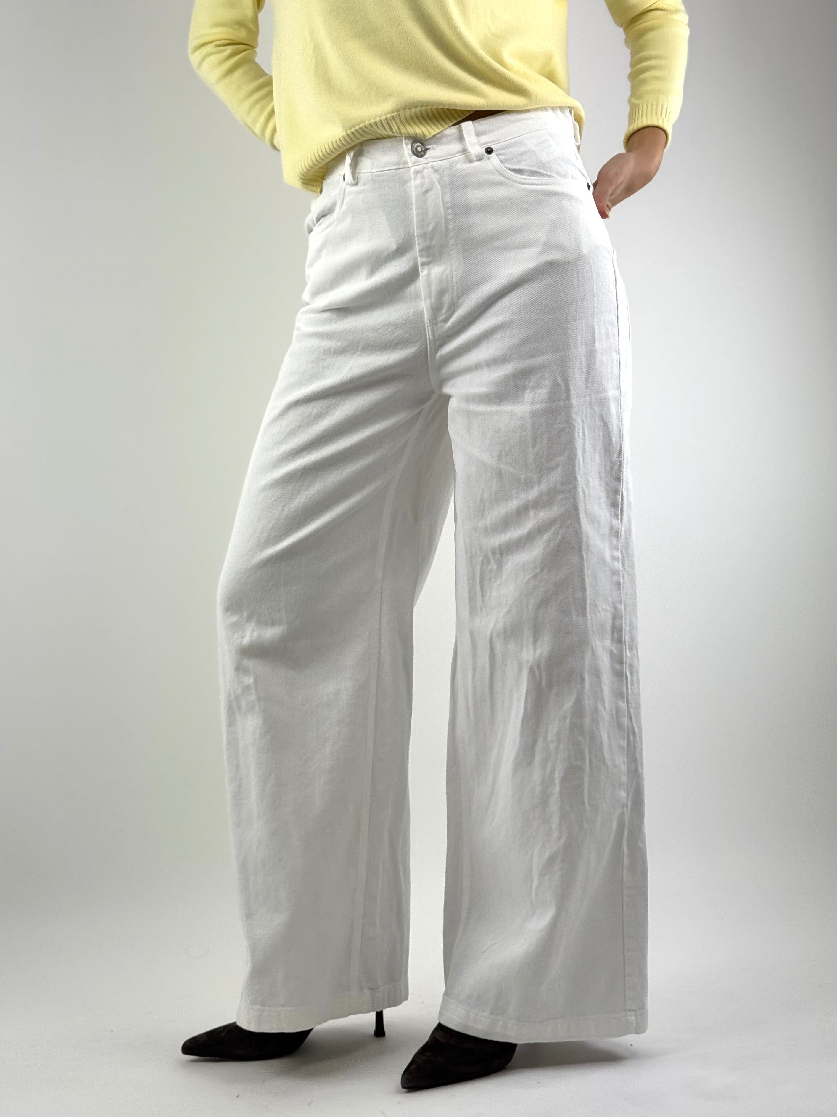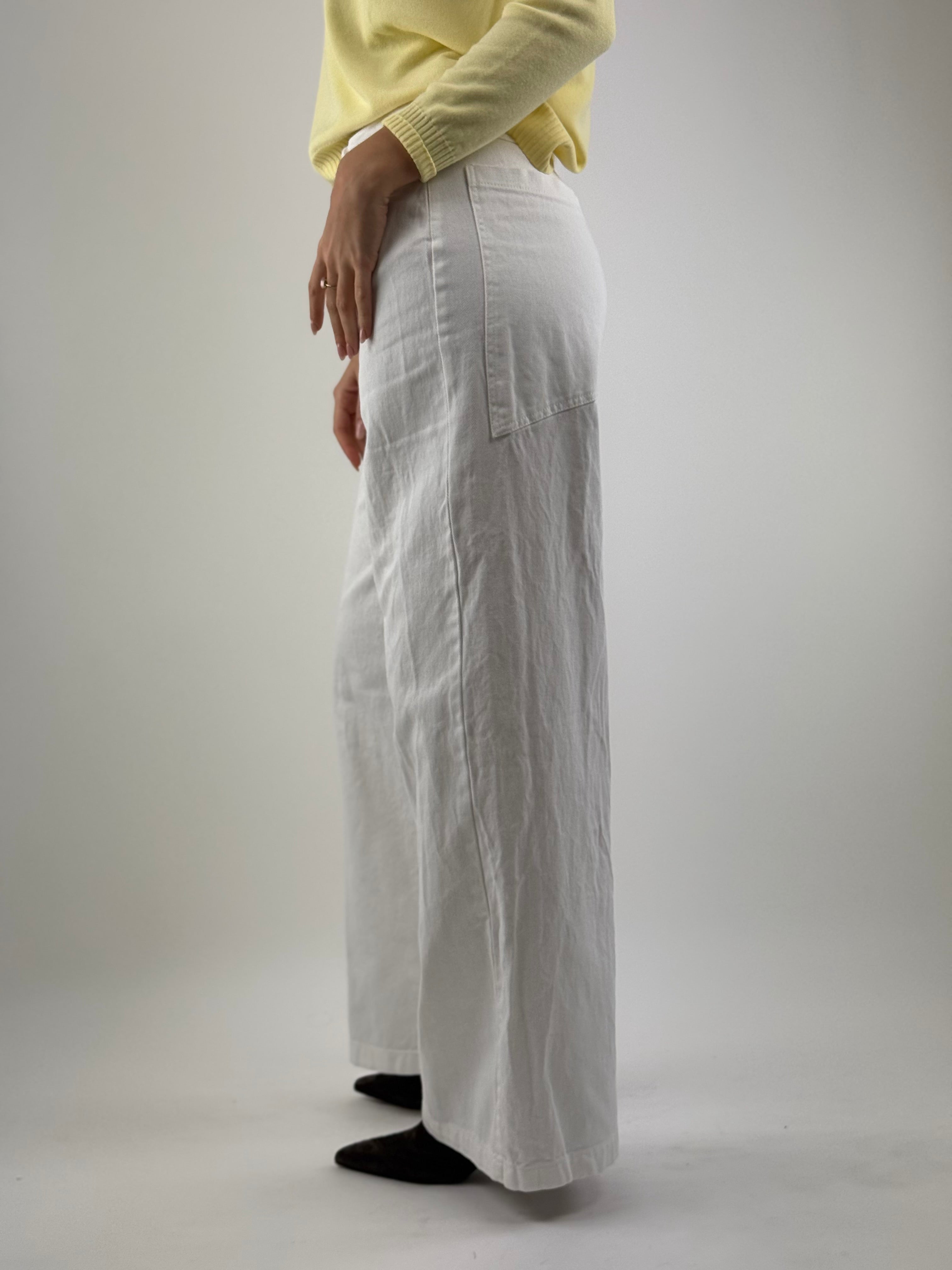 • Pantalone palazzo, vita alta, dalla gamba ampia, con tasconi sul retro .