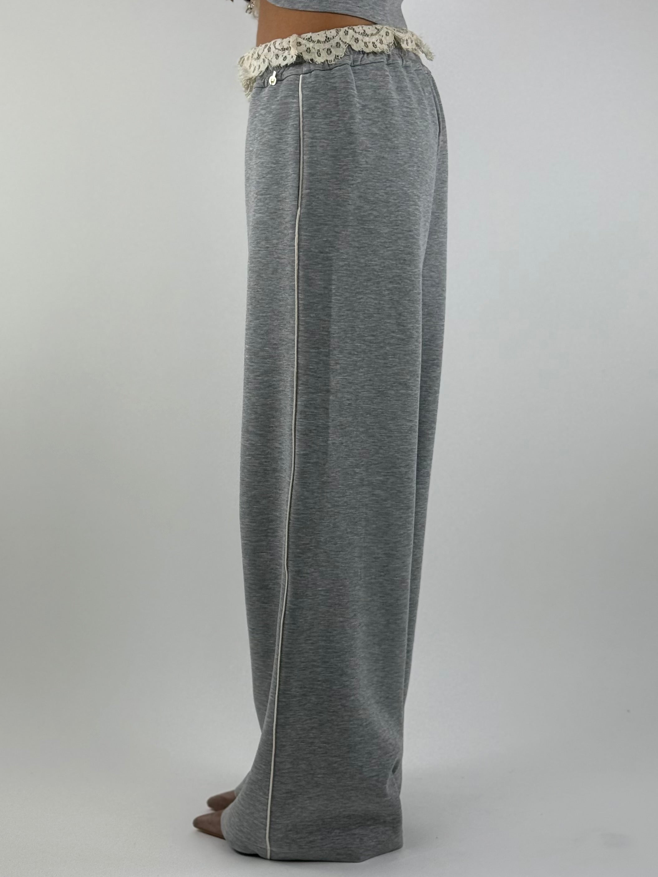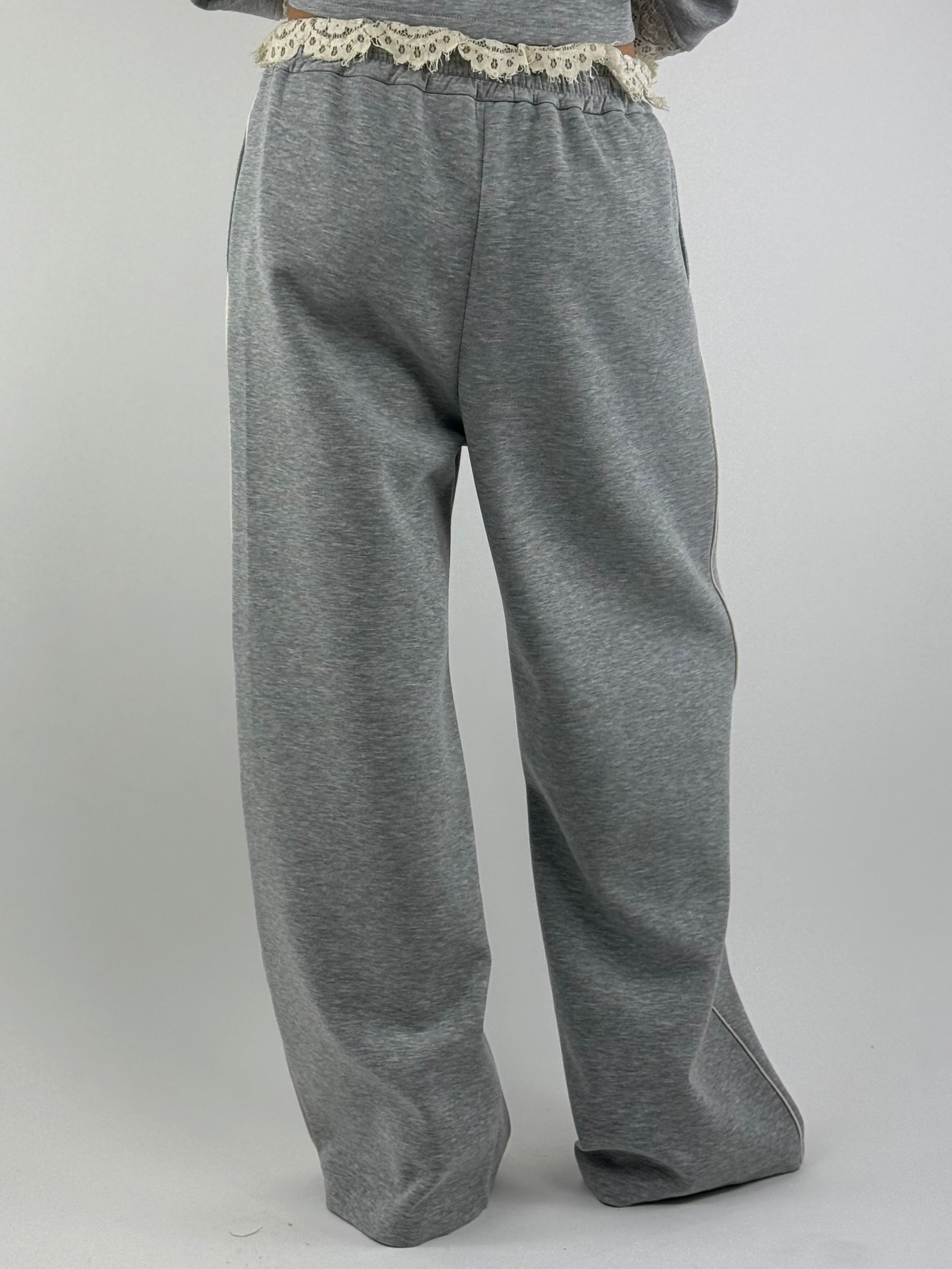 • Pantalone tuta, con pizzo in vita e banda sottile sul lato.