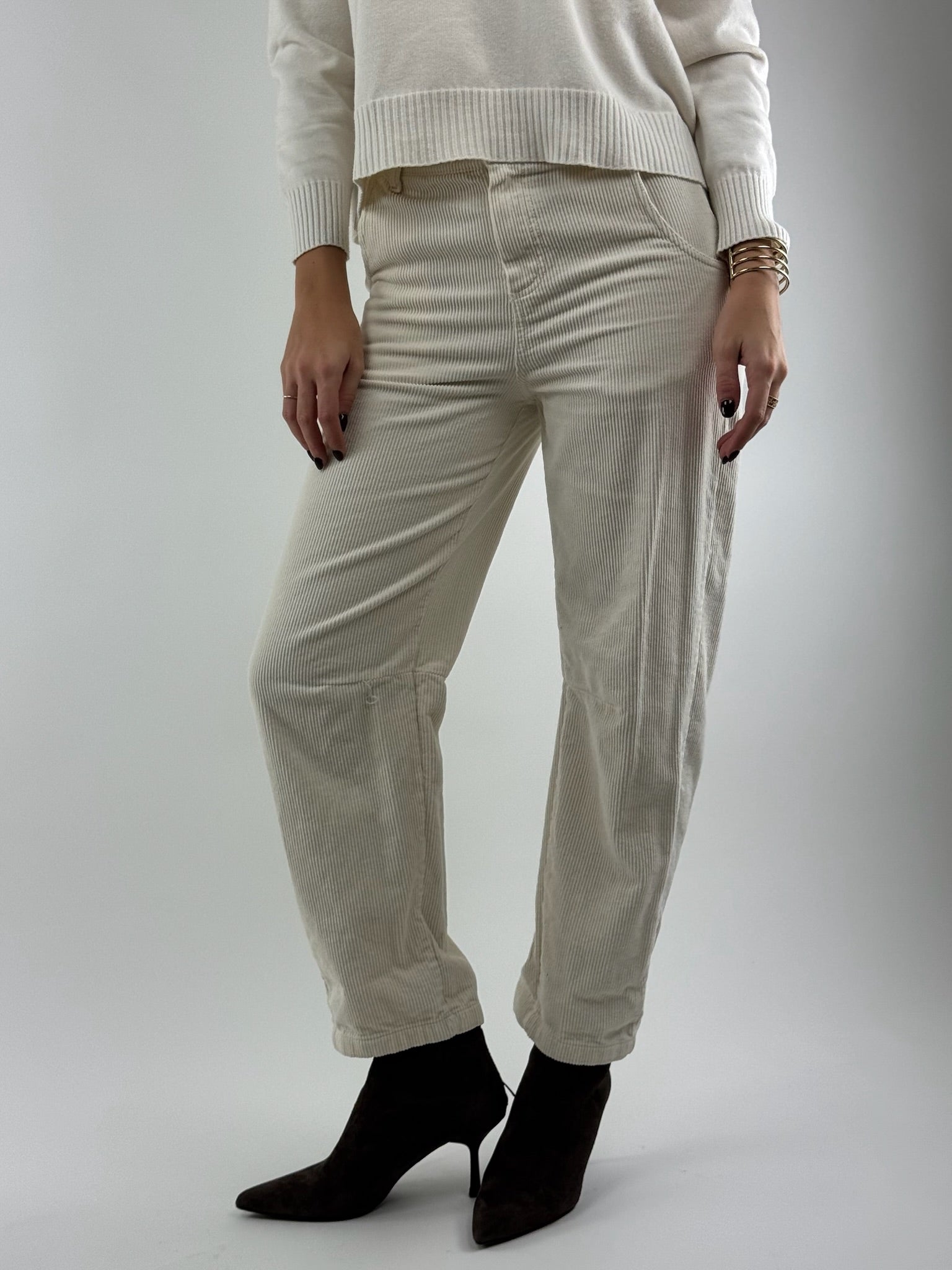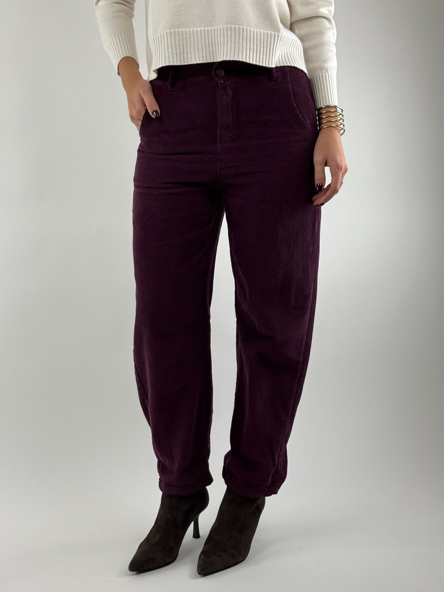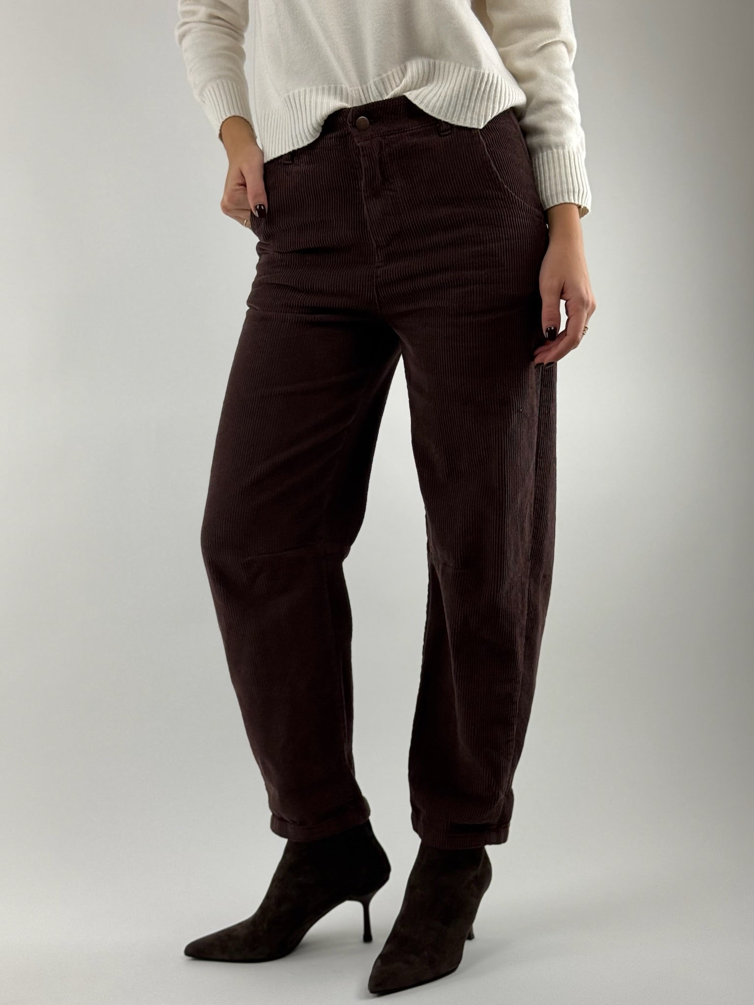 • Pantalone con elastico in vita, in velluto.