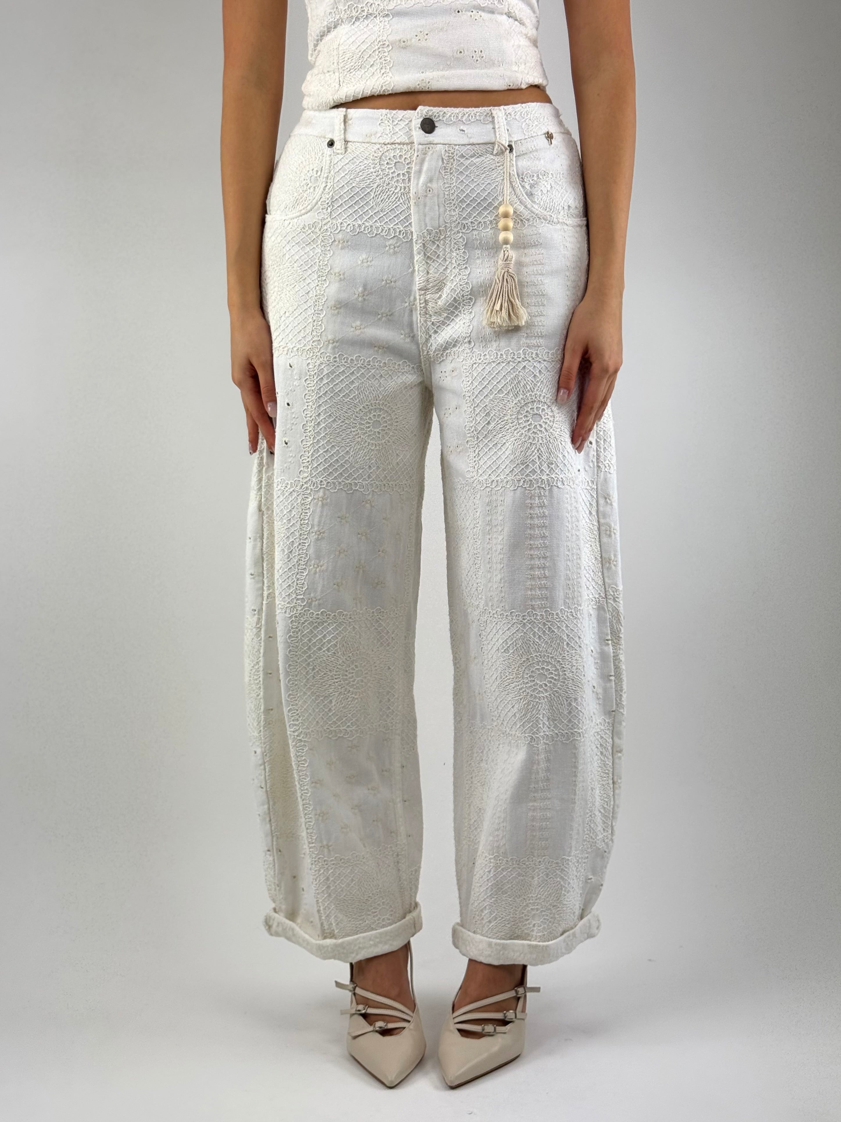• Pantalone a vita alta , ricamato , modello barrel.