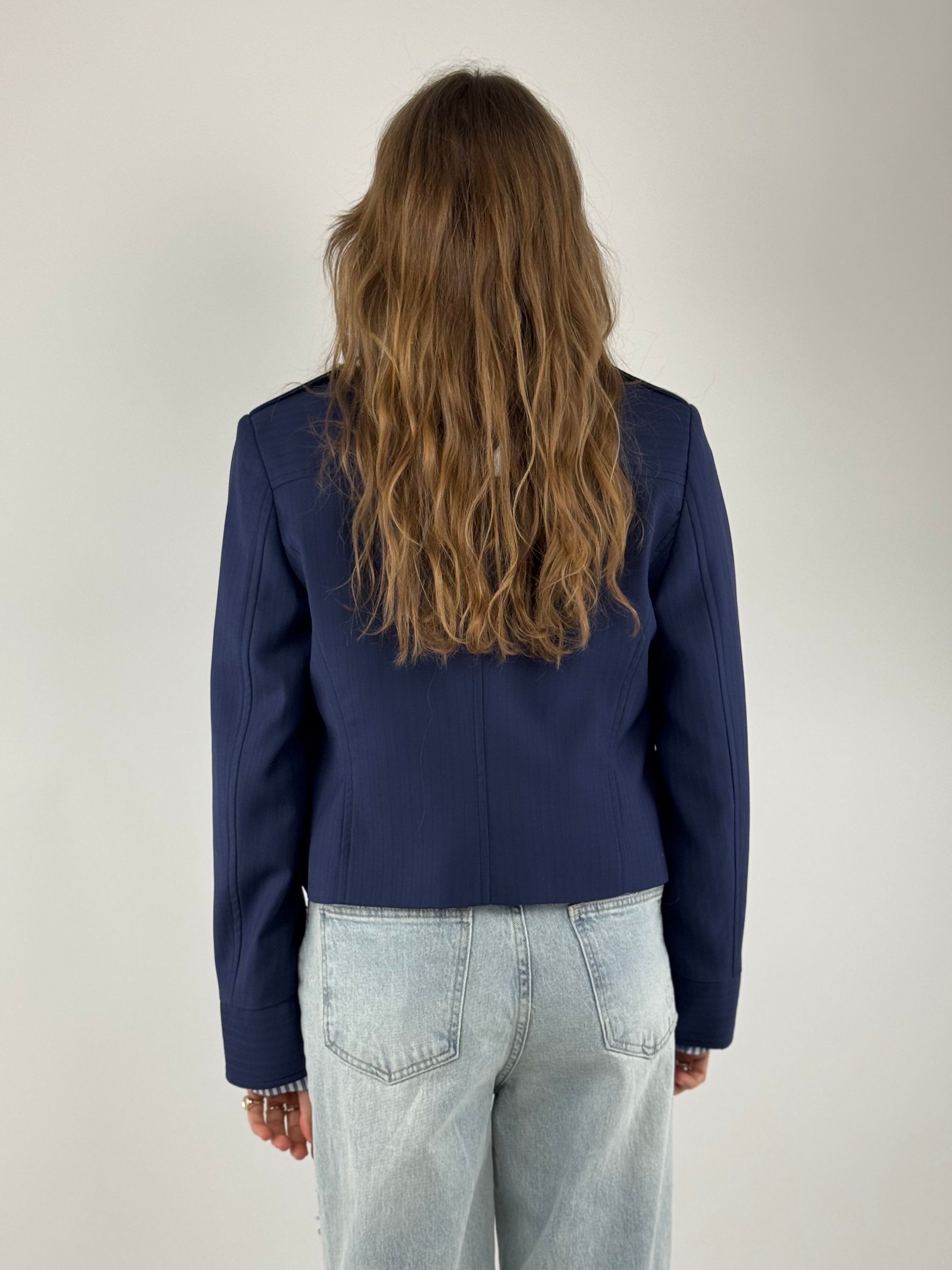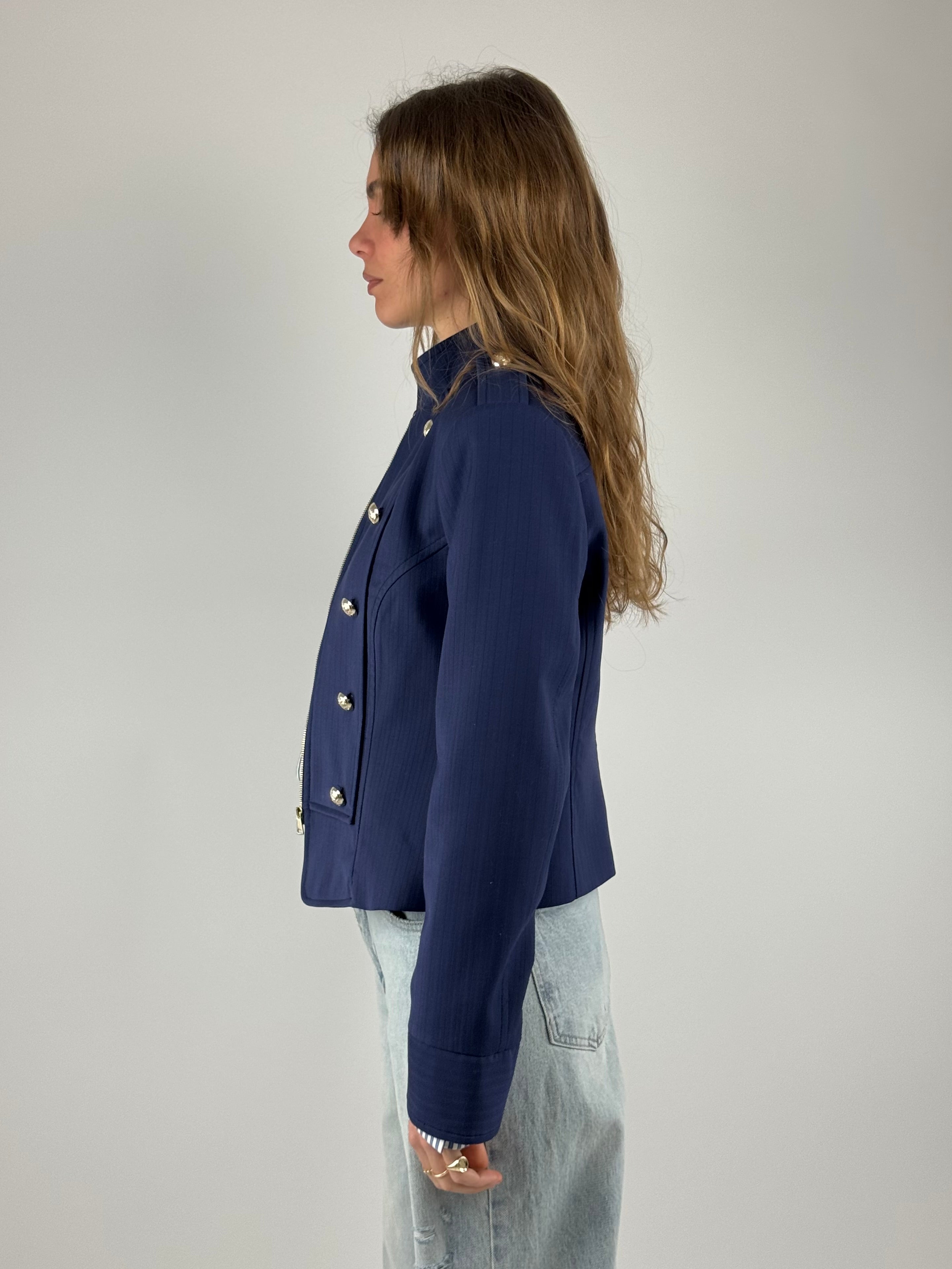 • Giacca sfiancata con bottoni oro applicati, foderata al suo interno .