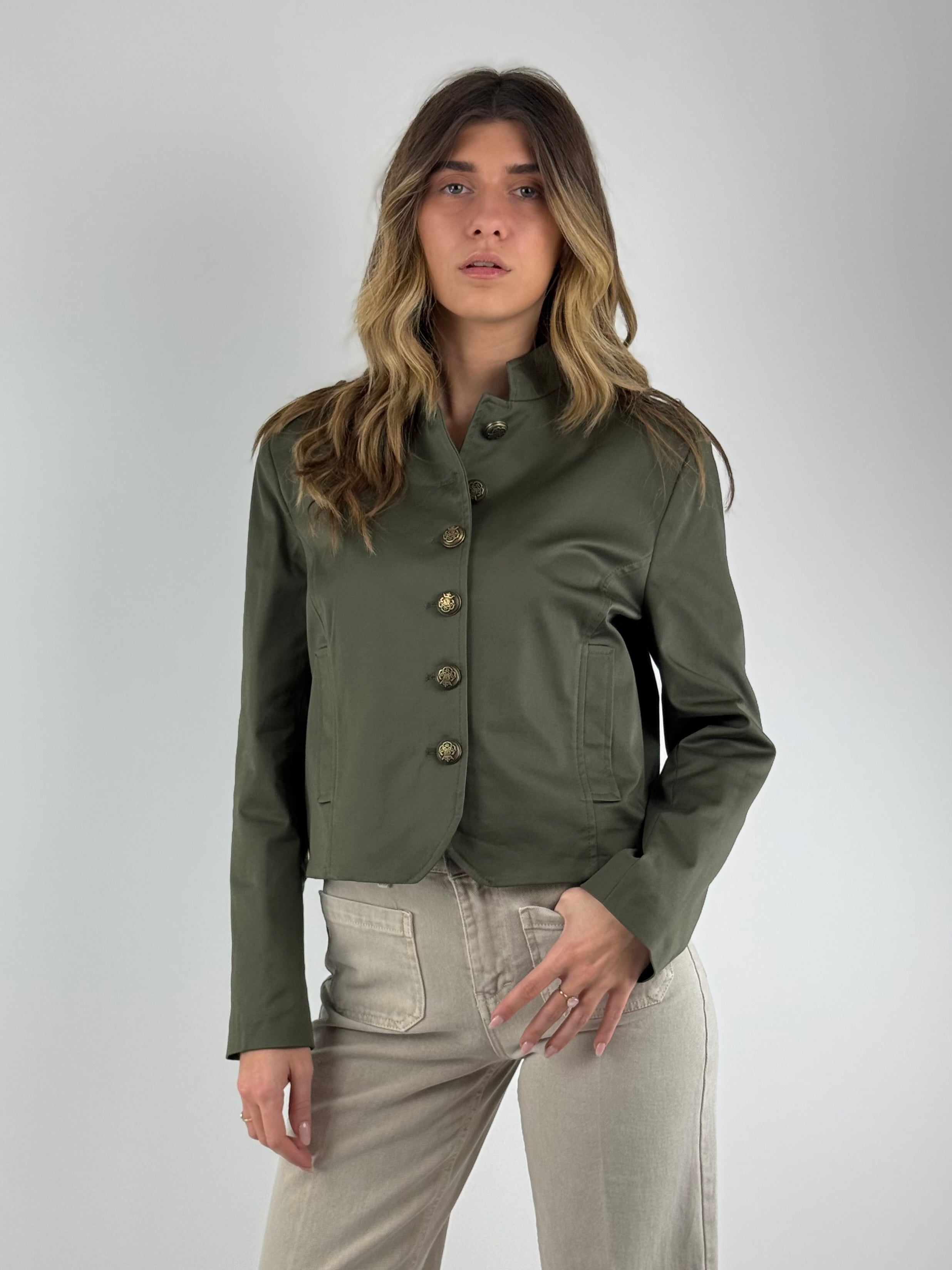 • Giacca crop con bottoni dorati , taglio dritto.