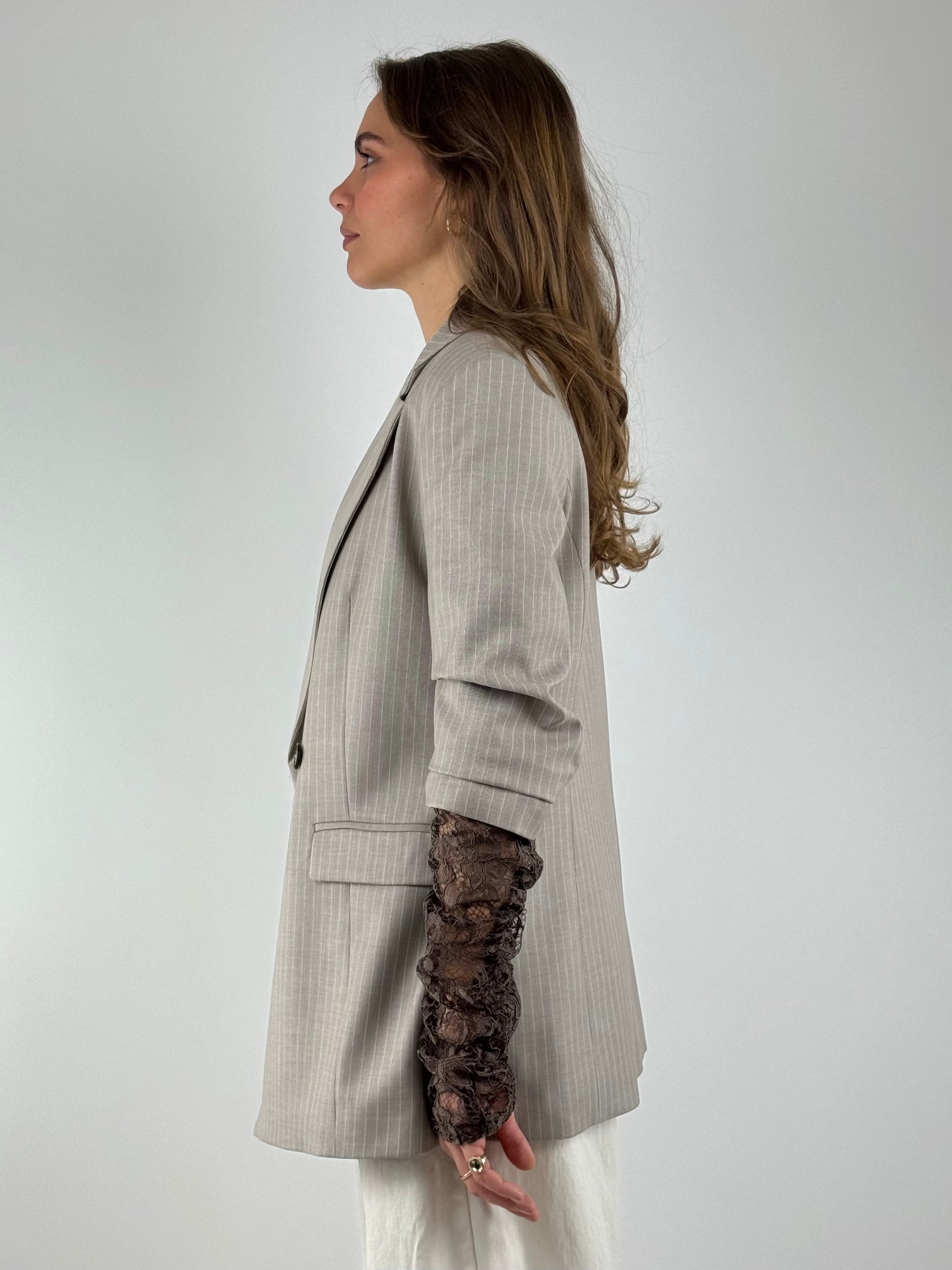 • Giacca gessata con maniche in pizzo, dal taglio morbido.